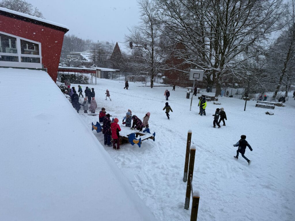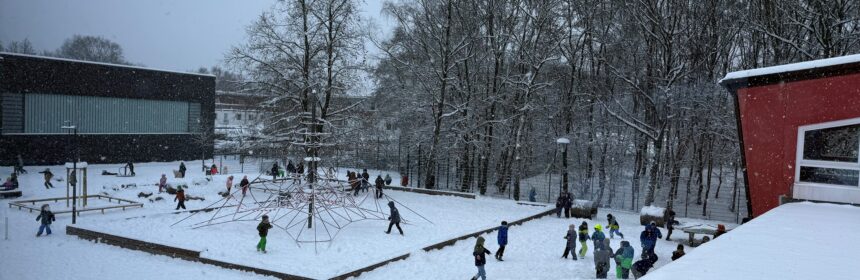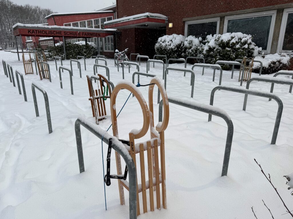 Schlitten statt Fahrrad und Schneeengel auf dem Schulhof– unsere Schülerinnen und Schüler freuen sich über die weiße Pracht.